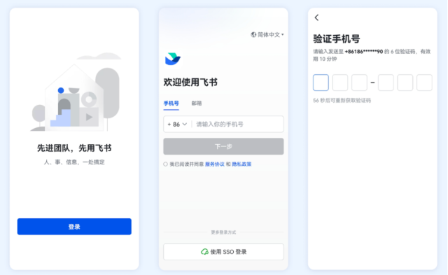 1、首次打開飛書客戶端,點擊登錄,輸入手機號,點擊下一步。輸入驗證碼完成驗證。注:如果你不是首次打開飛書客戶端,你可以直接輸入手機號開始注冊。